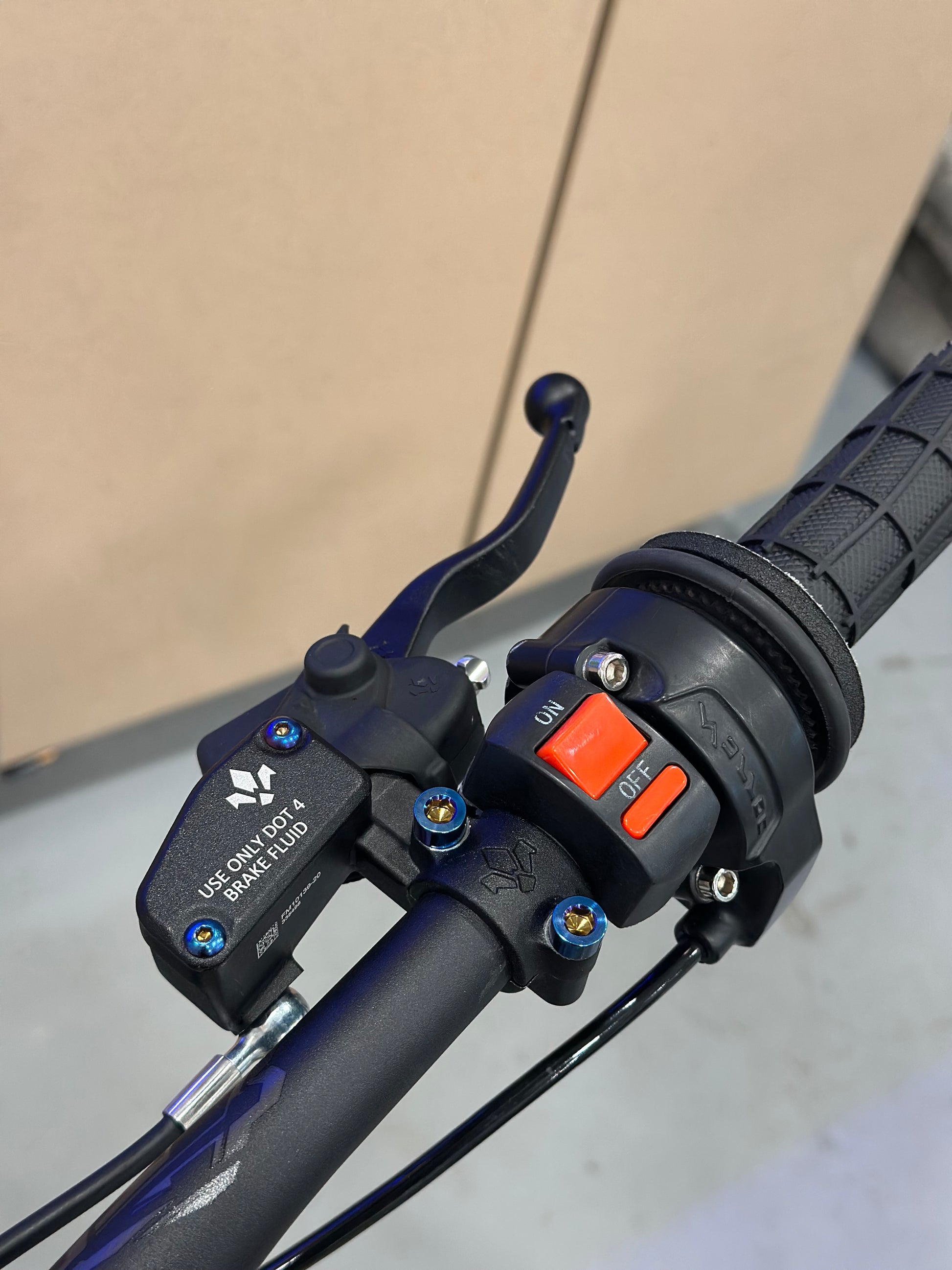 Set of 2 titanium burnt blue bolts for front/rear Formula Emoto or Ultra-Bee brakes. Will be shipped in 1-2 days.